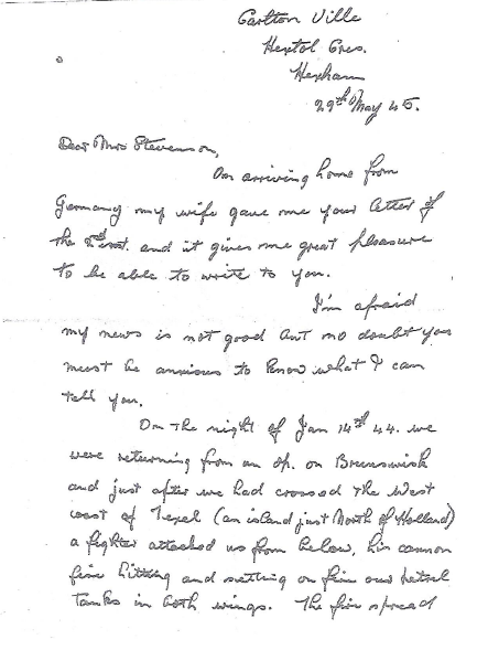 A letter from Ridley Brown, the bomb aimer on S-Sugar, one of the two survivors can be found here. It was sent to the mother of the navigator, Paddy Stevenson, who was seeking information about her son. The content is poignant and self explanatory. There must have been many letters like this after the war.